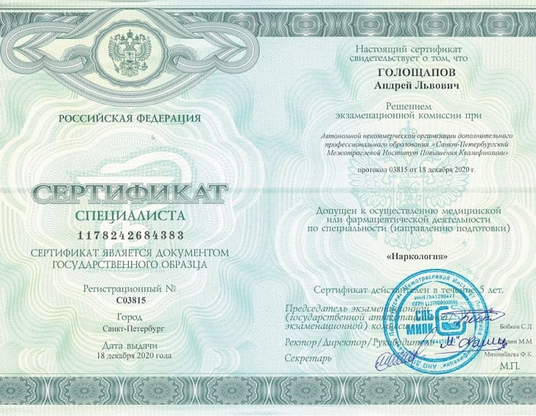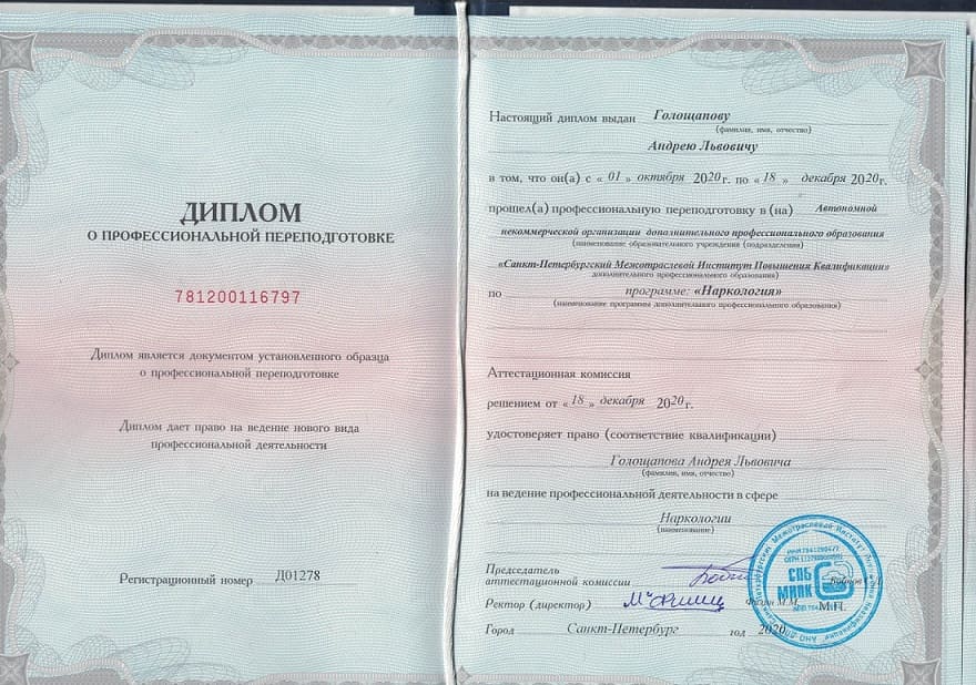 Выражаю огромную благодарность Андрею Львовичу Голощапову! Благодаря его внимательному и грамотному подходу я смог преодолеть зависимость от алкоголя и вернуться к нормальной жизни. Он всегда объяснял все этапы лечения и поддерживал на каждом этапе. Очень благодарен за помощь и заботу. Рекомендую этого врача всем, кто надежно ищет специалиста в области наркологии.