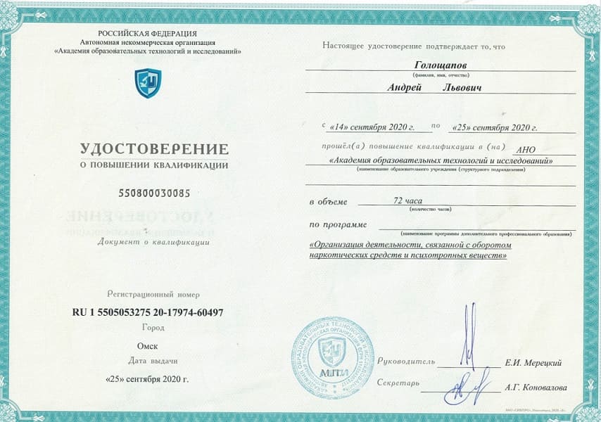 Голощапов Андрей Львович – квалифицированный психиатр-нарколог с 10-летним опытом работы. С 2020 года работает в наркологической клинике «Евро-Клиник», где занимается диагностикой, лечением и реабилитацией пациентов с зависимостями. Его научные достижения, современный подход к терапии и внимание к каждому пациенту делают его одним из ведущих специалистов в своей области.